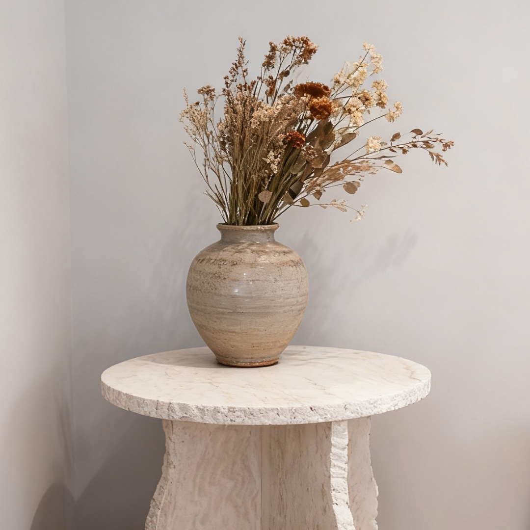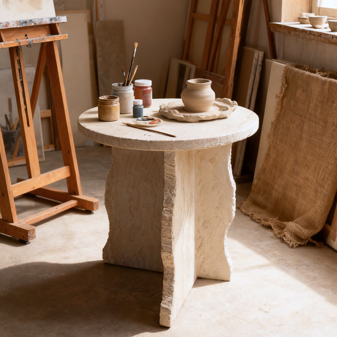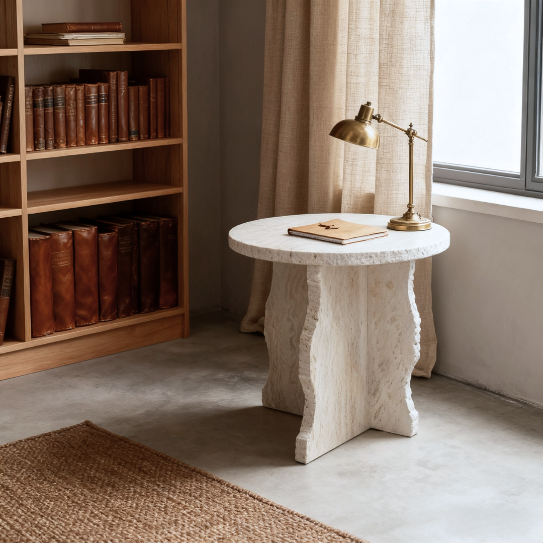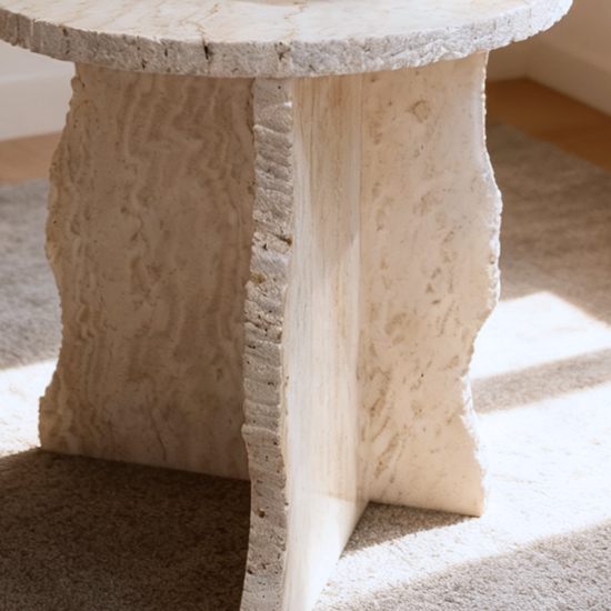 Crafted from White Travertine stone, Oro side table celebrates the quiet poetry of nature. Each piece bears its own unique pores and textures, distinctive markings that resemble a snow-dusted mountain peak. Sculptural yet grounded, it brings a serene, organic elegance to any corner of the home.